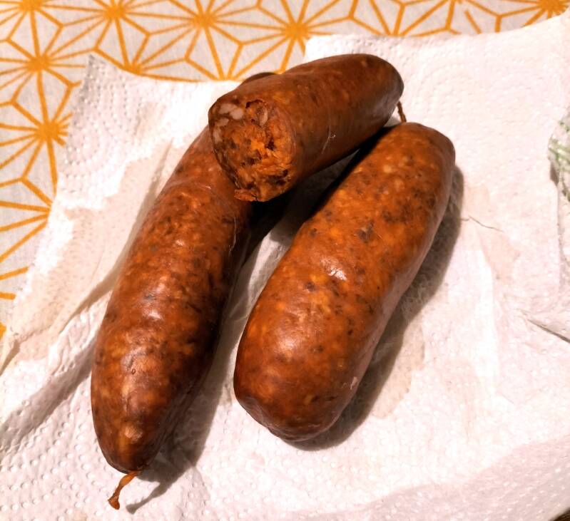 Celle que je préfère se présente sous la forme de plusieurs saucisses rouges (voir photo). Il en existe de la douce, tenue par une ficelle verte ou claire et la « piquante » munie d’une ficelle rouge. Elle peut se déguster crue sur des tartines de pain, ou frite ou encore comme ingrédient de certaines recettes.