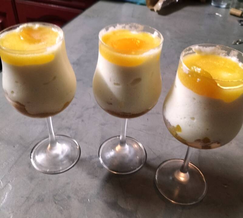 9 : Au moment de servir, répartir le coulis froid à la surface de chaque verre, déposer un oreillon et servir.