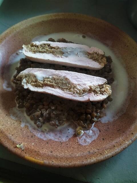 10 : Dans chaque assiette déposer au centre un lit de lentilles, sur ce lit déposer délicatement les 2 moitiés de ballotine et napper le tour des lentilles avec la sauce champagne. Éventuellement réchauffer chaque assiette entre 40 et 50 s au micro-ondes. Servir chaud.