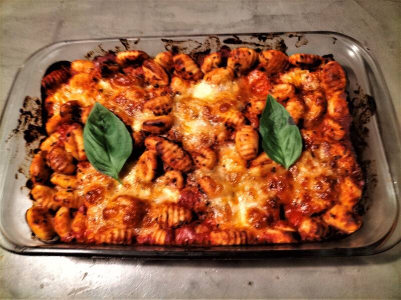 - 3 : Dans un plat à gratin, placer les gnocchis sur le fond, verser la purée de tomate, saupoudrer de basilic, saler / poivrer et mélanger le tout