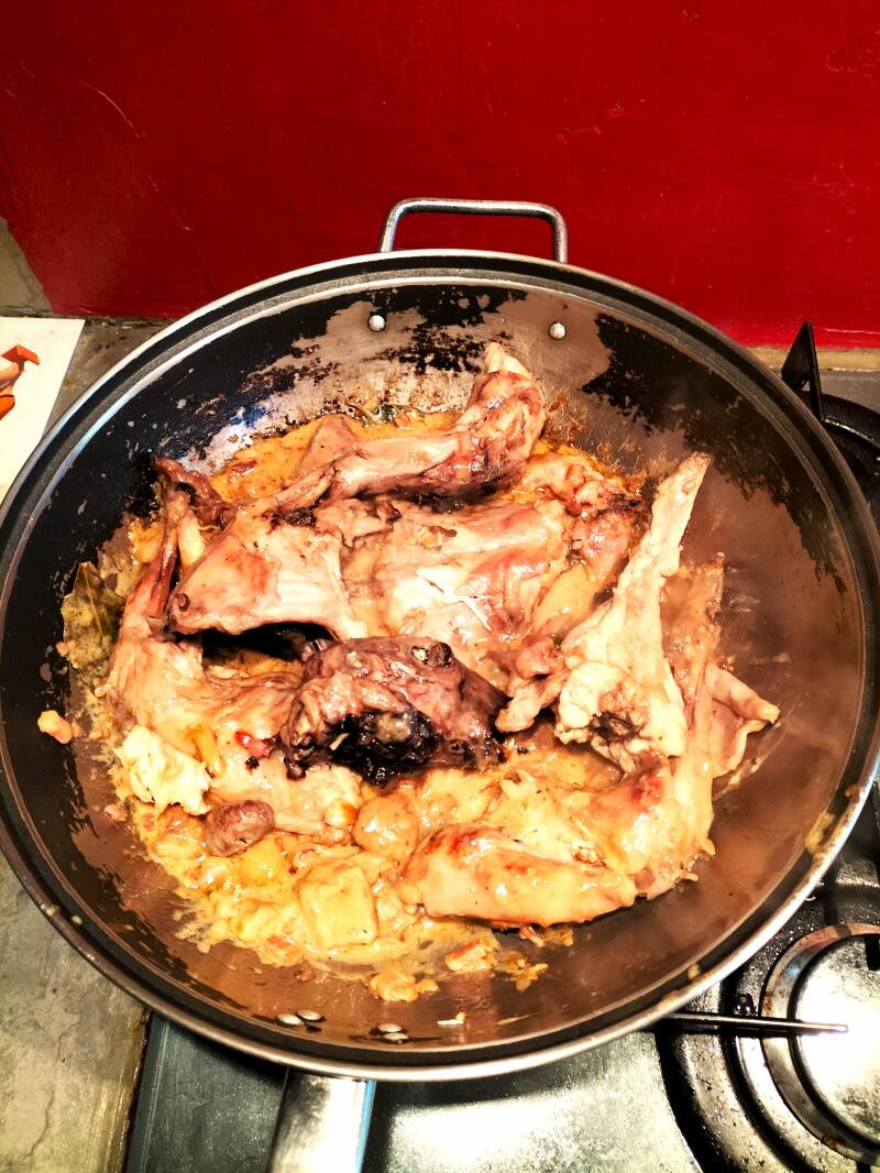 2 : Dans une grande sauteuse ou wok, sur un fond d’huile faire dorer le lapin découpé en morceaux, puis réserver la viande dans un plat