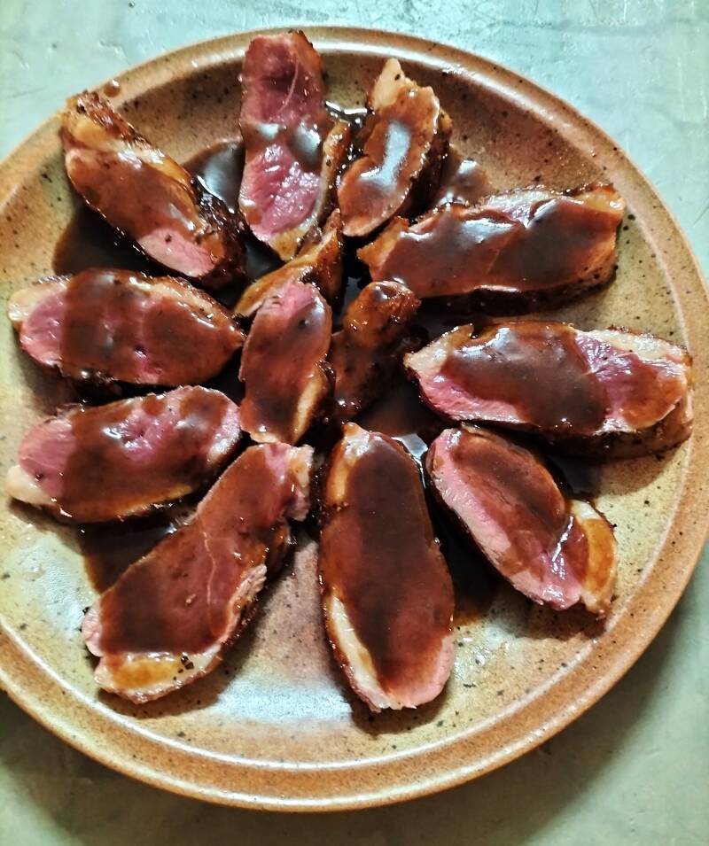 9 : Découper le magret en lamelles, dresser dans une assiette et napper de la sauce.