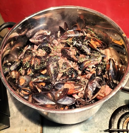 Moules au cidre, aux lardons fumés et champignons forestiers
