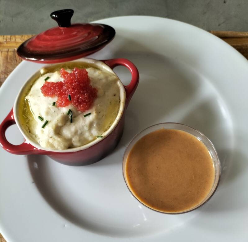 15 : A la sortie du four, verser un soupçon de beurre fondu sur chaque cocotte, déposer quelques brins de ciboulette et quelques grains d’œufs de lump rouge
