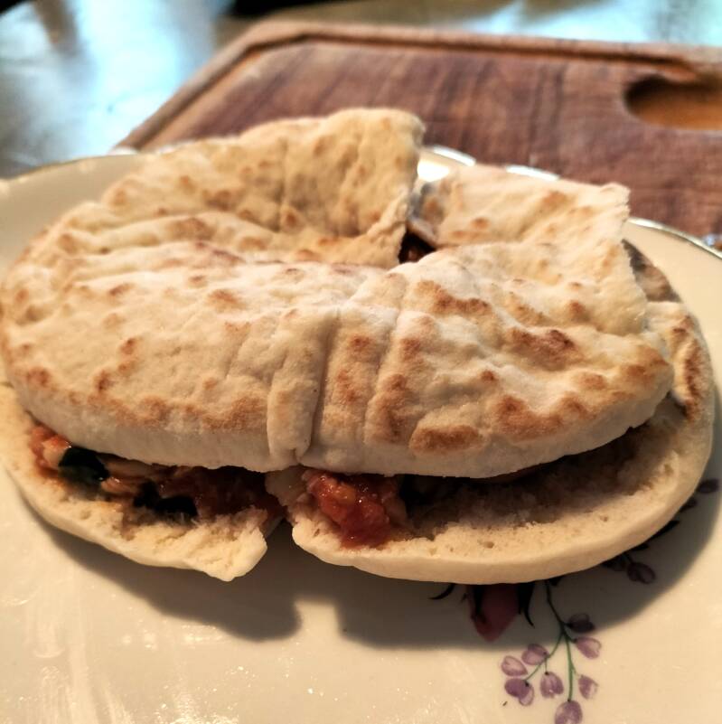 Le pain « Pita », est une sorte de pain libanais, le seul que j’ai réussi à trouver, n’était pas honnêtement très fameux, un peu sec ! Il faut alors être généreux sur la sauce.