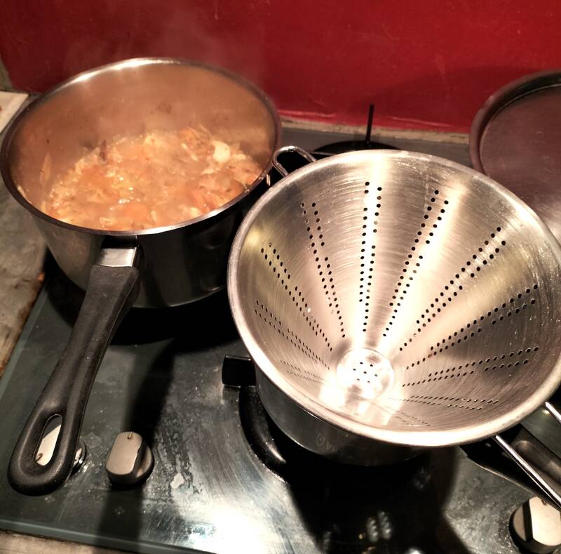 12 : Filtrer le tout à travers un chinois en écrasant tous les ingrédients pour récupérer la bisque