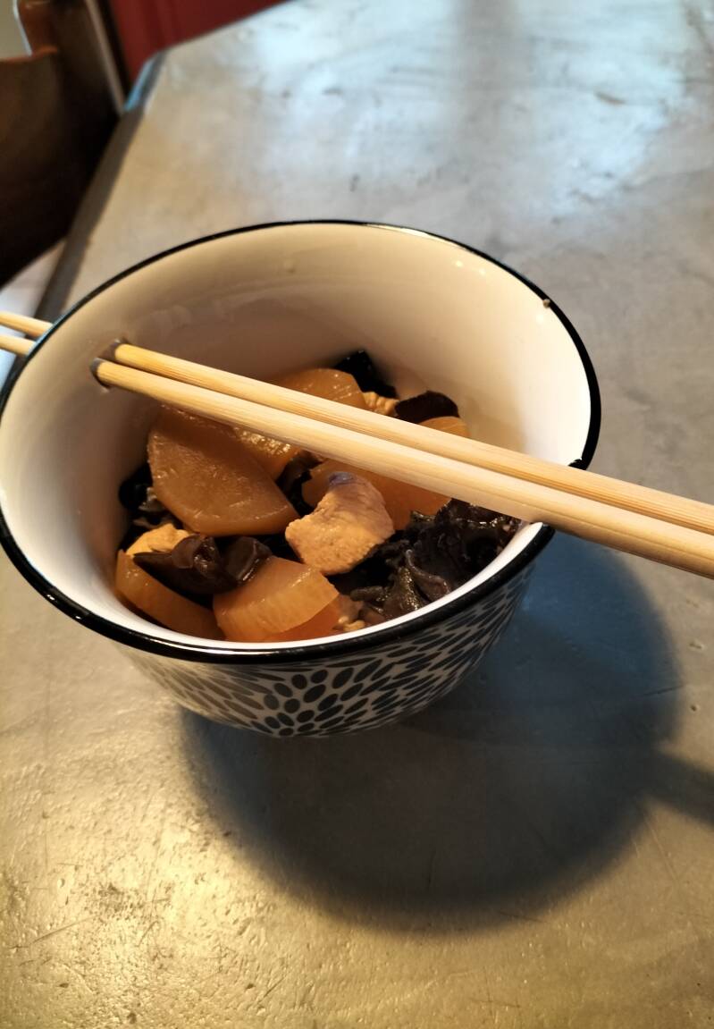 5 : Vérifier que les « Daikon » soient moelleux, ajouter le poulet et poursuivre la cuisson de 5 à 8 mn environ.