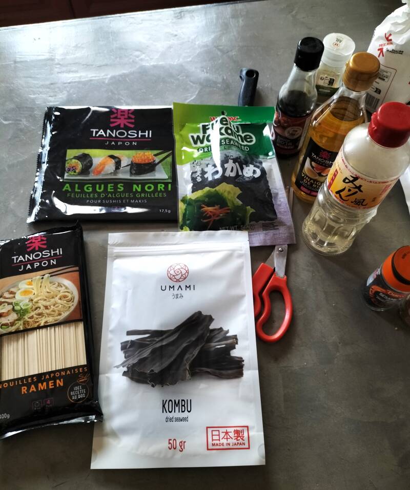 N.B. : L’algue Kombu réhydratée cuit dans le bouillon, mais l’algue Nori se ramollit simplement dans le bol au contact du bouillon versé. L’idée de consommer des algues peut heurter les esprits, mais c’est bon !!! Attention pour les personnes ne pouvant trop absorber de potassium, il est plus prudent de vérifier avant.