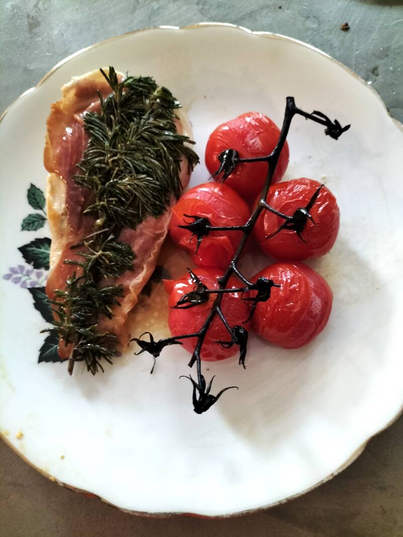7 : Déposer dans chaque assiette, un filet de poulet et une grappe de tomates, arroser avec le reste de jus chaud.