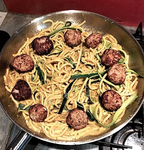 6 : Remettre la préparation de courgettes à feu doux, ressortir les spätzles à l’aide d’une araignée (ou d’une écumoire) et les rajouter dans la poêle, remuer le tout.