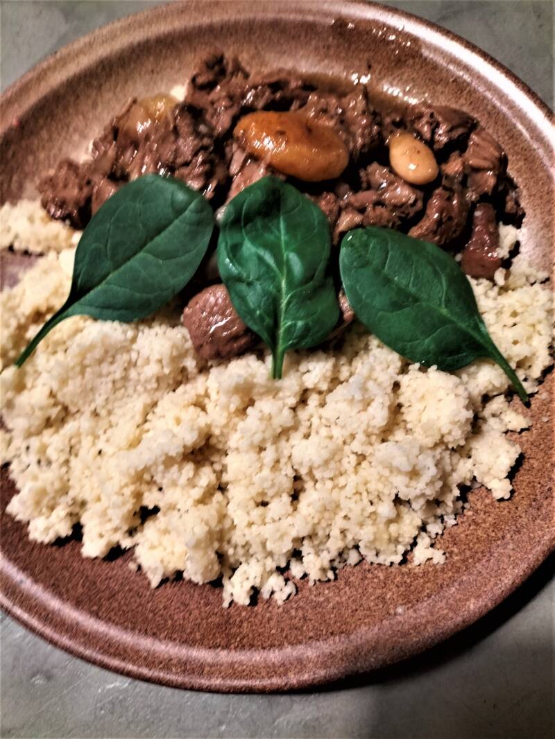 8 : Servir chaud une part de semoule, de tajine et décorer de quelques pousses d’épinard