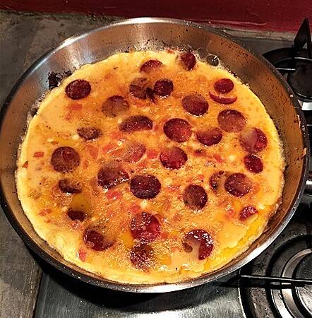 6 : Se resservir de la poêle, remettre un fond d’huile, faire chauffer à feu vif, verser la préparation, éparpiller sur toute la surface les rondelles de chorizo, baisser le feu et laisser cuire jusqu’à la consistance désirée (baveuse ou plus cuite), retourner la tortilla sur une assiette et remettre à cuire sur l’autre face.